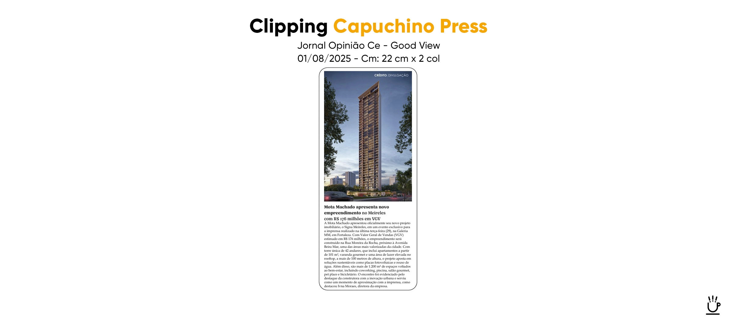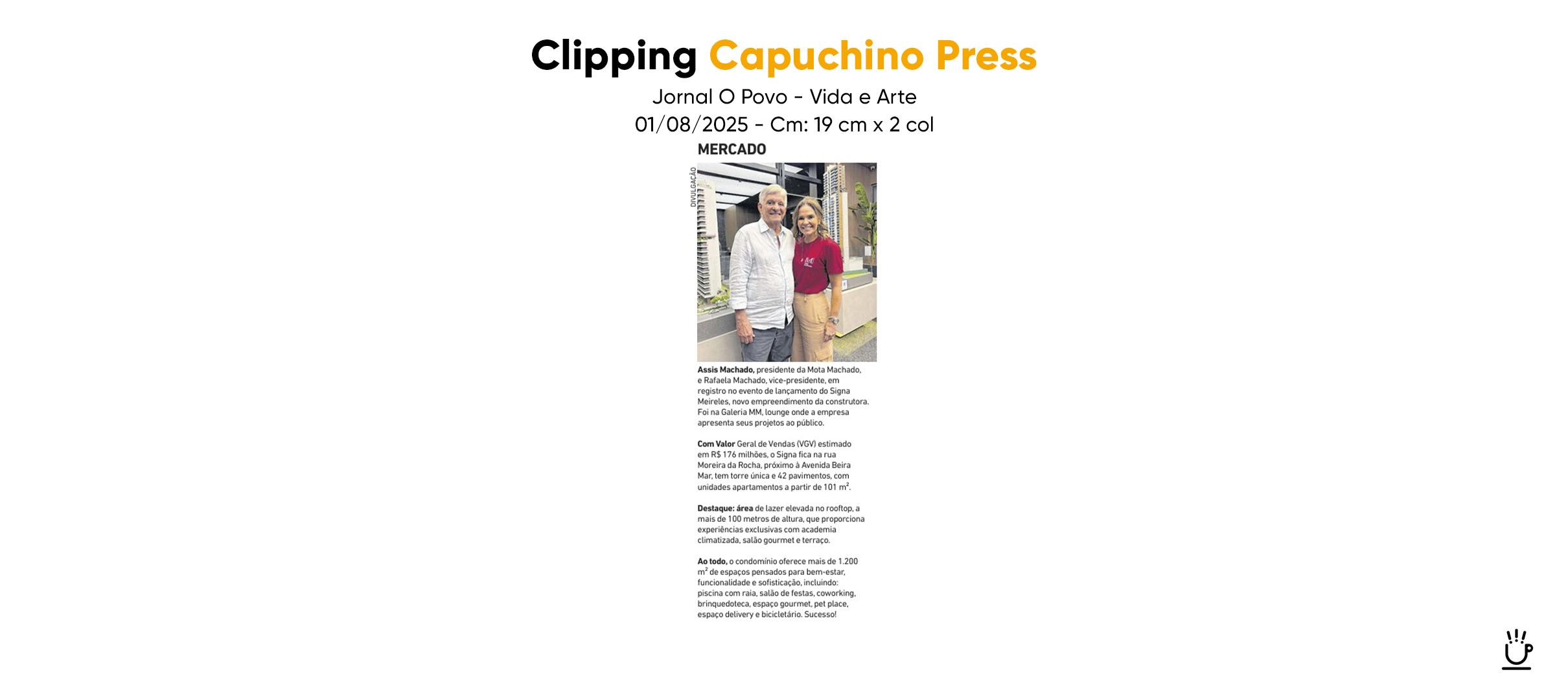 A Mota Machado, uma das maiores referências da construção civil no Nordeste, lançou o Signa Meireles, empreendimento de VGV de R$ 176 milhões e conceito orientado ao lifestyle urbano contemporâneo. A Capuchino Press foi a responsável pela condução estratégica da comunicação e relacionamento com a imprensa durante todo o ciclo de lançamento.